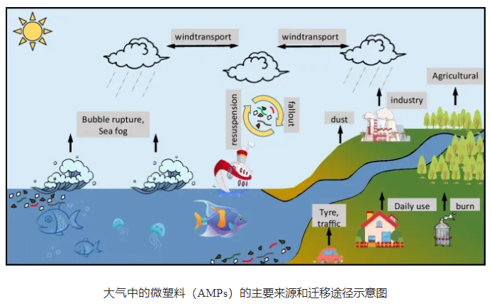 微塑料在大气中无处不在,平均寿命从一周到几周不等。它们可能来自工业活动的直接排放、较大塑料垃圾的破碎以及从陆地和水生环境的传输。大气中的微塑料(Atmospheric MPs,AMPs)对人类健康、气候强迫和空气质量有着重要影响。